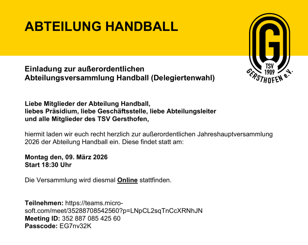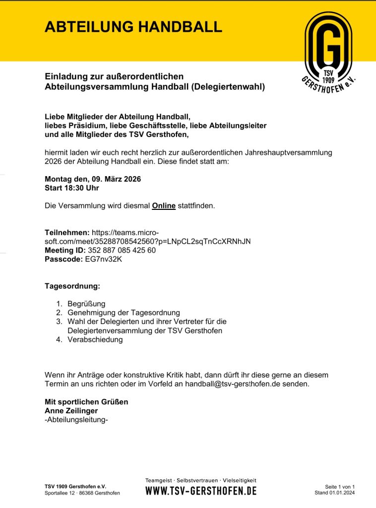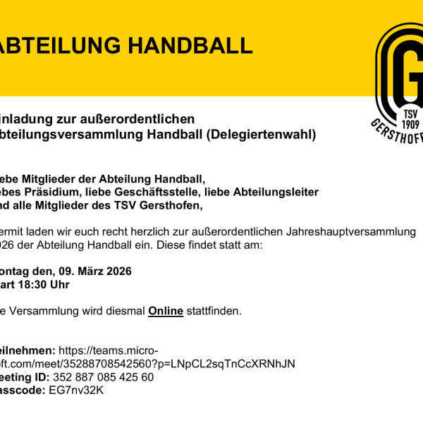 Einladung zur außerordentlichen Mitgliederversammlung Handball – TSV Gersthofen